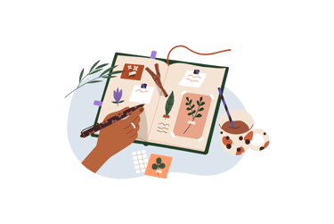 É a arte de criar álbuns personalizados com recortes, fotos, frases e detalhes decorativos.